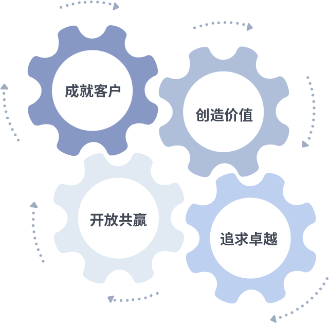 成就客户是一切决策的出发点,创造价值是衡量所有工作的标准,追求卓越是九洲国际做事做人的态度,开放共赢是九洲国际的格局也是最终的结果。价值观的齿轮环环相扣,推动着组织里的每个人不断向前。
